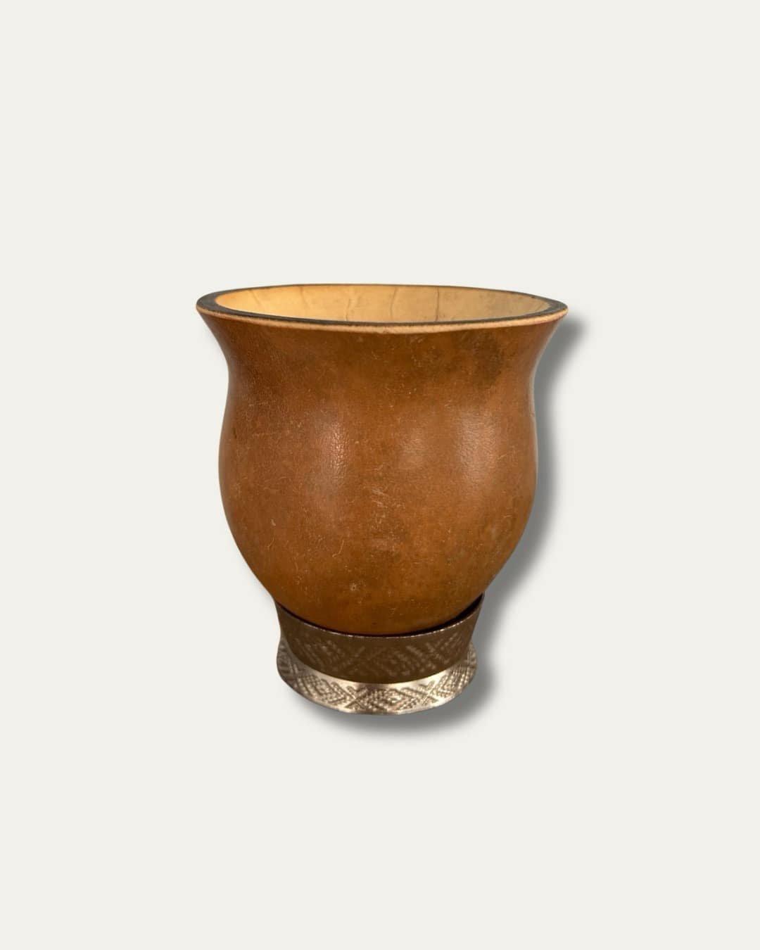 Mate artesanal realizado en calabaza natural pulida, con base de metal que le permite mantenerse en pie por sí solo, un diferencial poco común en este tipo de mates. Su diseño combina tradición y funcionalidad, aportando comodidad en el uso diario.