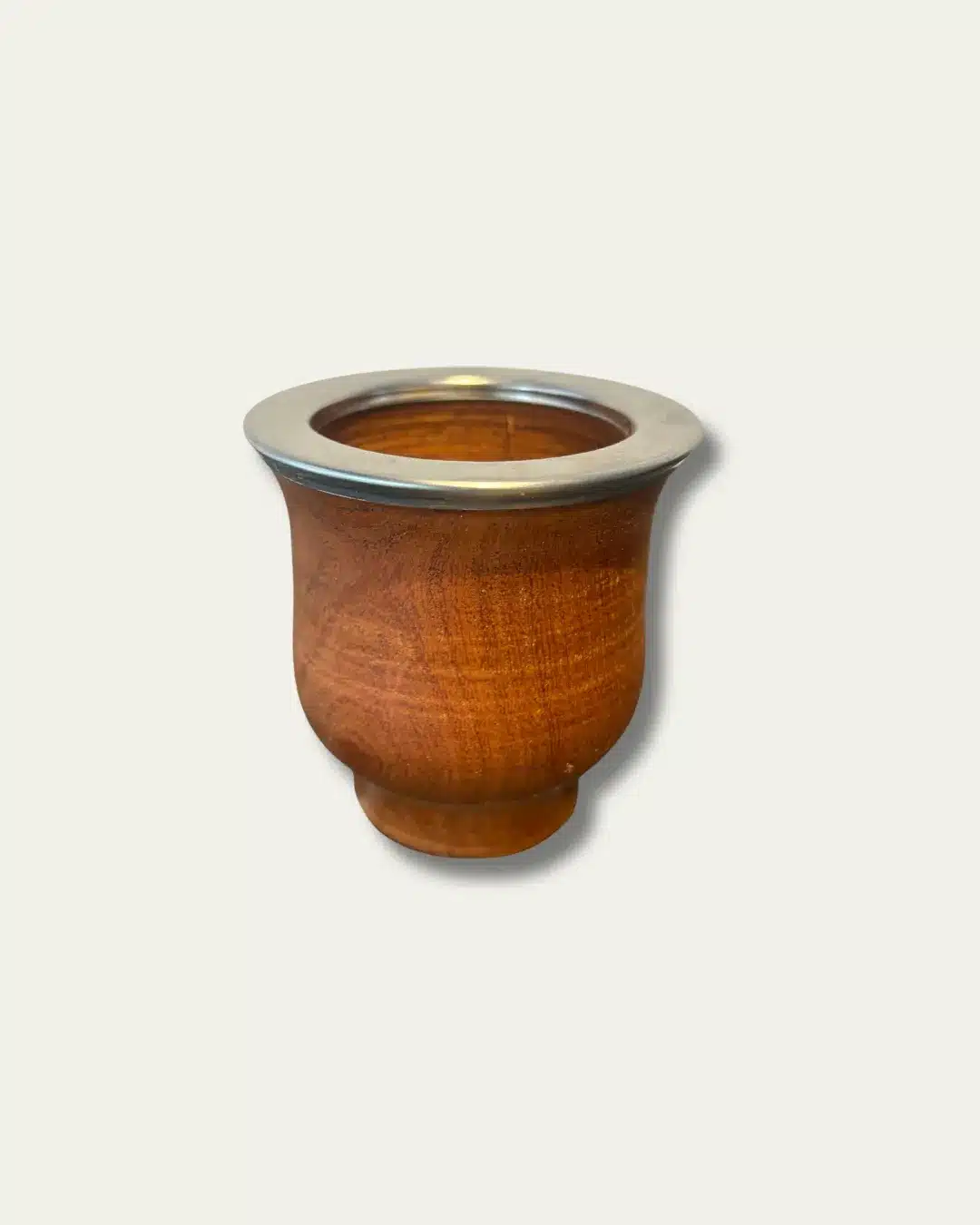Mate artesanal tallado en madera de algarrobo, de diseño liso que resalta la belleza natural de sus vetas. Su virola de alpaca lisa aporta un detalle clásico y elegante, logrando un equilibrio perfecto entre tradición y distinción.