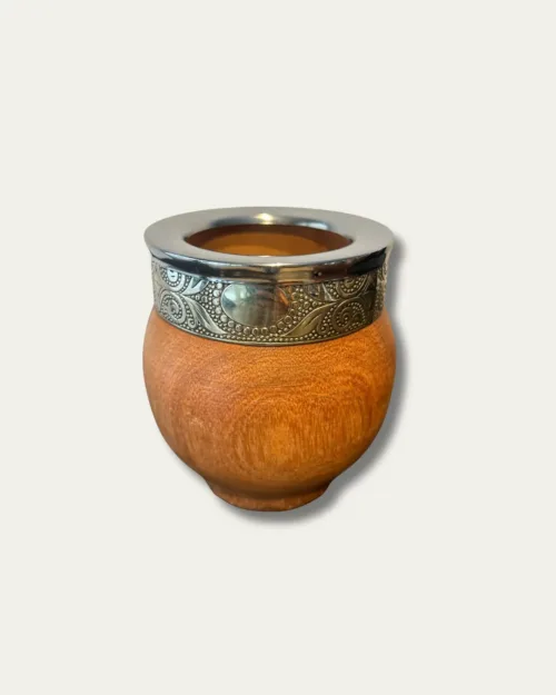 Mate artesanal tallado en madera de algarrobo, de diseño liso que resalta la belleza natural de sus vetas. Su virola lisa realizada en alpaca aporta un detalle clásico y elegante, logrando un equilibrio perfecto entre tradición y distinción.