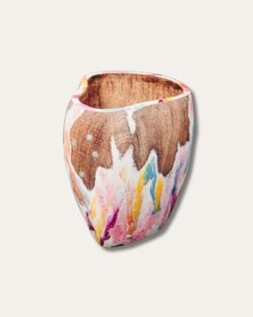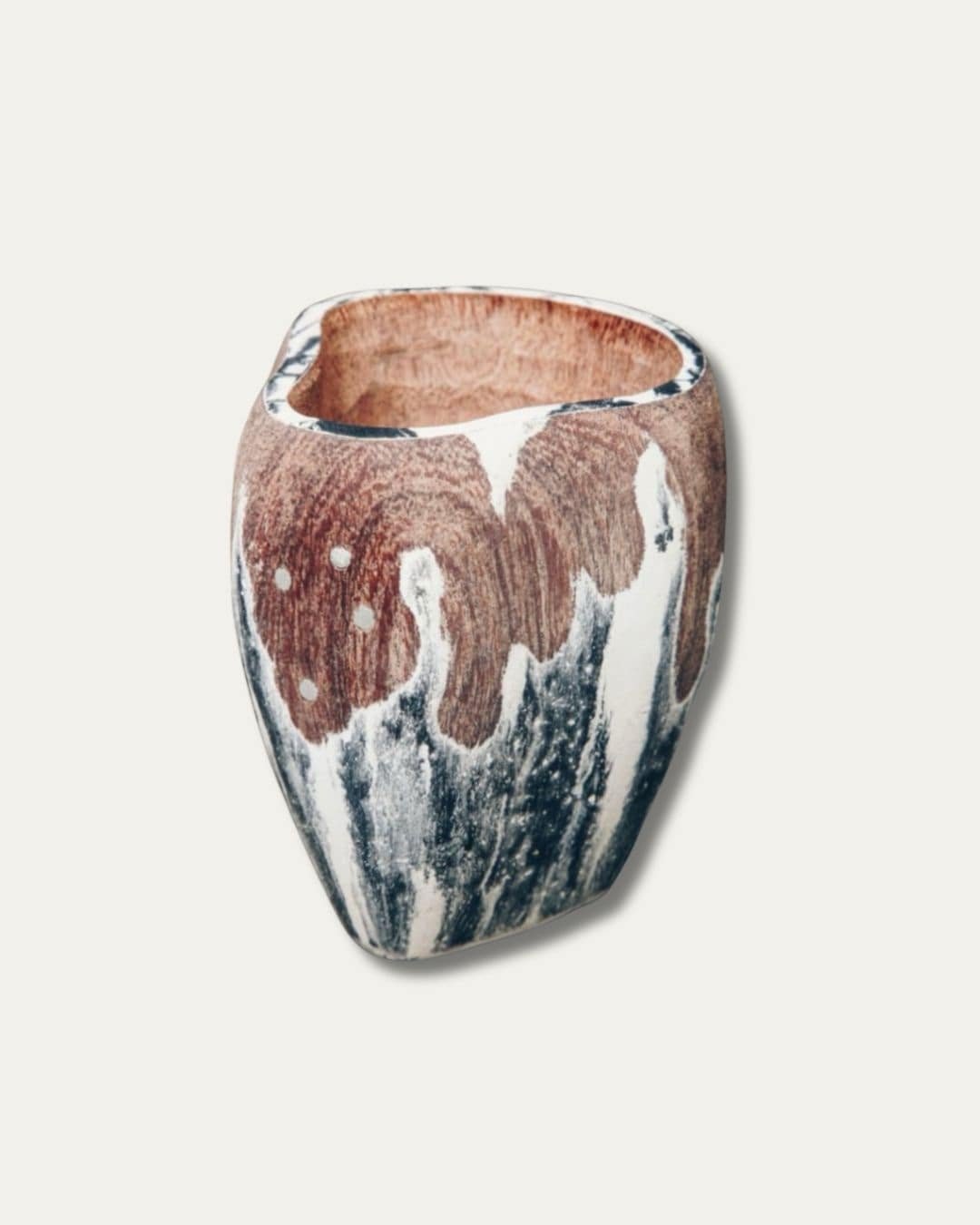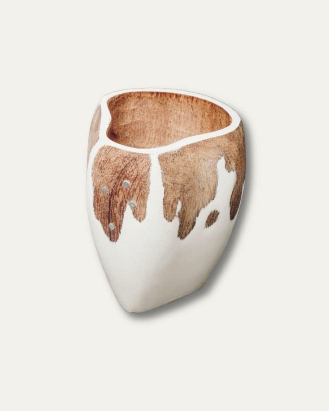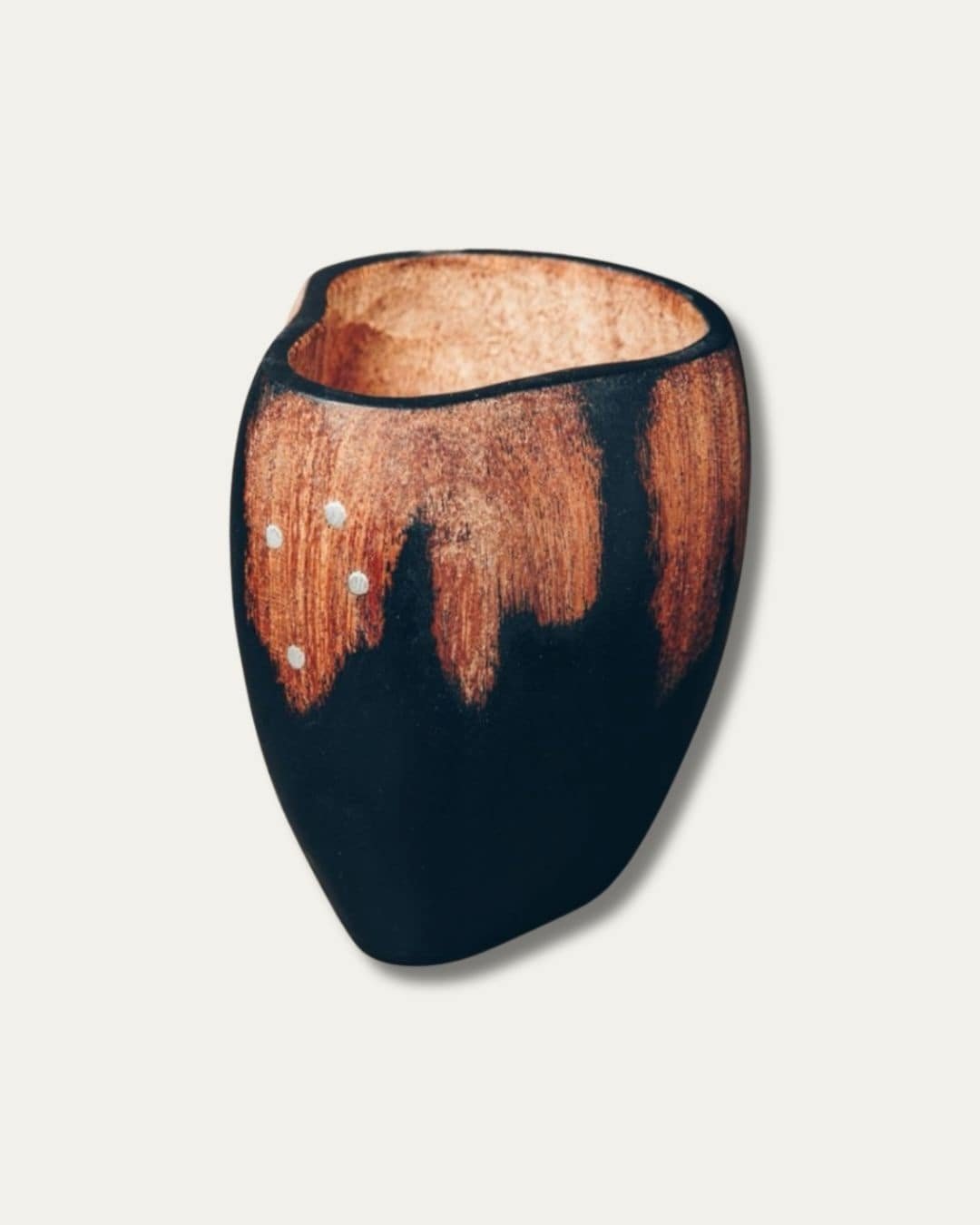 Mate tallado en madera de algarrobo, pintado a mano y con la clásica incrustación de cuatro clavos que representan la Cruz del Sur. Cada pieza es única y forma parte del diseño original registrado por Sasha, lo que garantiza autenticidad y una calidad que se distingue a simple vista.