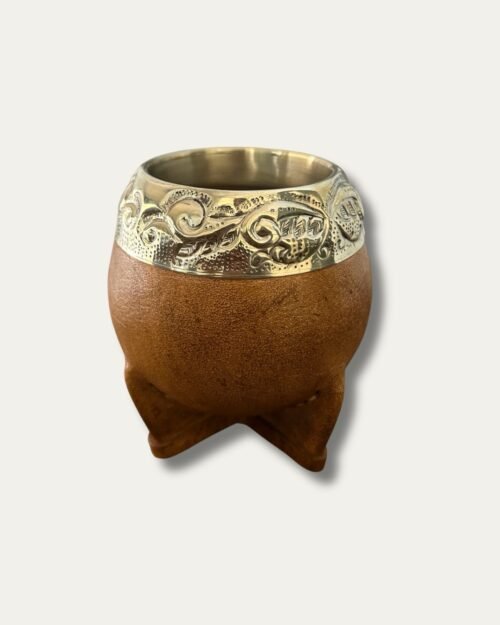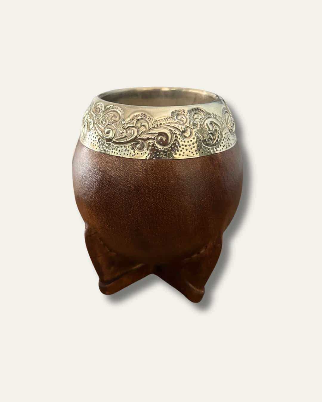 Mate estilo torpedo en versión joyería, confeccionado en cuero suela con terminación símil madera, que resalta una estética cálida y sofisticada. Su virola con detalles de joyería aporta un acabado más trabajado y distintivo, elevando la presencia de la pieza.